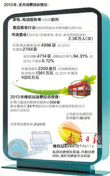 发布会上,邓国平通报了2013年东莞市消费维权重大事件。他说,去年一年,家电、电信服务等仍占据投诉前列,美容美发行业的投诉则是去年影响最大的行业。