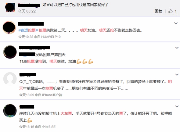 也有网友表示“连续几天都没能抢上火车票”,甚至有人调侃“如果可以把自己打包用快递寄回家就好了”。未抢到票的网友们摩拳擦掌,“备战”除夕当天的火车票。