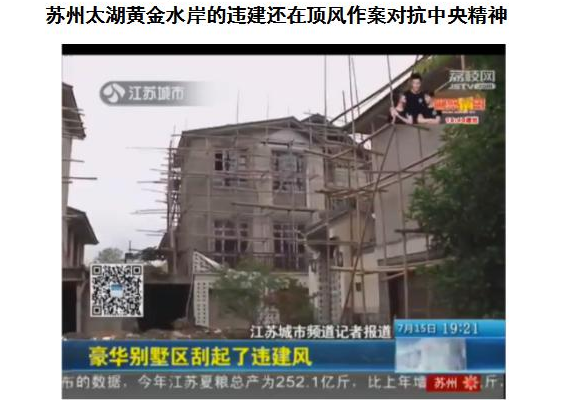 就在2018年7月底,一场轰轰烈烈的专项整治行动曾席卷三秦大地。截至2018年9月27日,仅西安市鄠邑区和长安区,就已累计拆除违建1085宗,其中别墅类594栋683套。中央办公厅也通报了处理秦岭违建别墅问题的情况,不仅指陕西省委、西安市委严重违反政治纪律,还对相关党组织和人员作出了严肃处理。全国各省、直辖市多地召开会议,学习传达贯彻中央通报精神。但是,中央精神在苏州却似乎“泥牛入海”,没有了号召力和执行力。在苏州市境内的太湖黄金水岸别墅区违建问题上,江苏省、苏州市许多领导却表现出匪夷所思的“麻木”,他们无视中央指示精神,对出现的问题视而不见、听而不闻,毫无担当、放任自流!