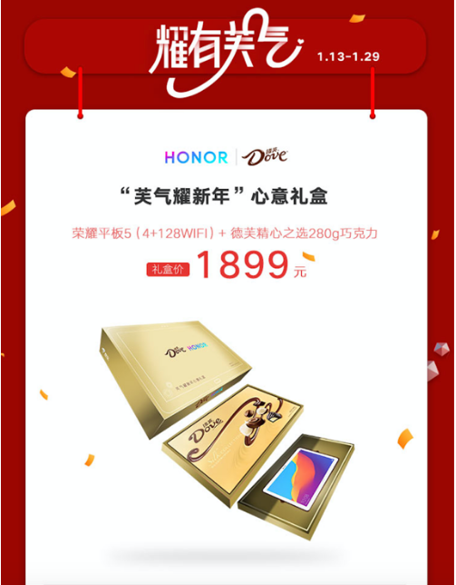 “荣耀年货节,新年换新机”,春节前最大一波促销狂欢年货节终于如期而至!凡在1月13日至1月17日荣耀年货节促销专场下单荣耀平板5的用户,可立即享受直降100元福利以1299元就能把新年影音利器荣耀平板5备货到手!不仅如此,此次荣耀更是邂逅浪漫丝滑的巧克力品牌德芙,值年货节期间限量推出「芙气耀新年」心意礼盒,打开礼盒不仅坐拥一款4GB+128GB的豪华版荣耀平板5,更有一波德芙精心之选的巧克力倾情相送,让你和你爱的人在新年佳节既能一边乐哈哈看平板,也能美滋滋品尝出诱人甜美。
