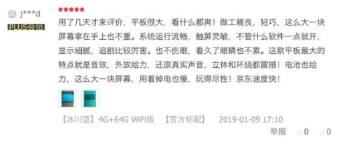 荣耀平板5在10月11日发布后,仅历时3月便已业内民间积累下不凡口碑,在京东累计超过2.4万条评价同时收获99%的超高好评度,足以彰显出2018年最后一季度用户对于这位“影音王者”的一致认可。最新出炉的用户评价也表示荣耀平板5大屏看得更过瘾,流畅细腻音效震撼。