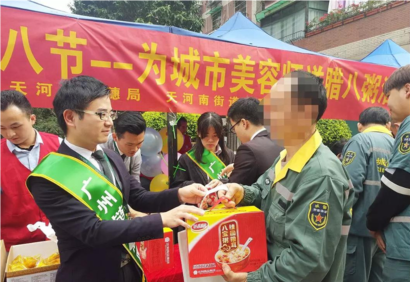 1月13日,今年的腊八节,就有这样一场最温馨美好的活动在广州市天河南街中轴线广场上演。广州市广仁来穗人员服务中心联合广州链家等热心公益企业,发起了“我们的节日·腊八节--为城市美容师送腊八粥”大型公益活动,给天河南街250多位环卫工人免费送上一份美味的腊八粥和小食。
