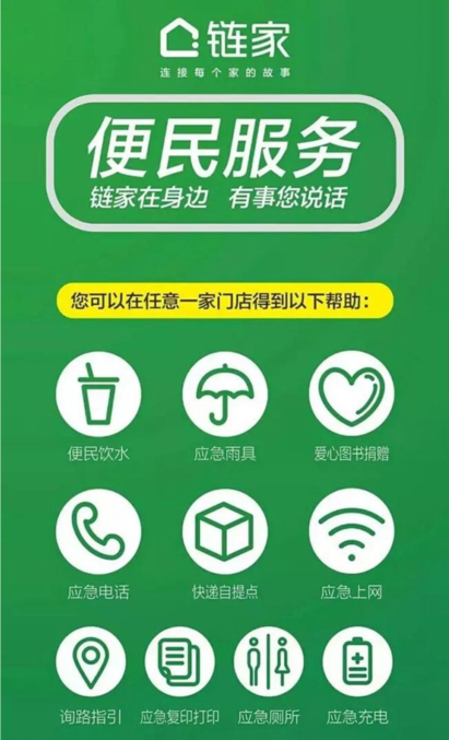有市民将链家门店亲切地称呼为:城市补给站,因为每一个链家门店,不仅为环卫工人提供便利,还为所有市民提供包含:免费打印、复印、电话、饮水、厕所、传真等在内的十大便民服务。这些关爱如同绵绵细雨,虽不猛烈,却因为解决了市民生活中细碎应急的小事,而持续地温暖了人心。