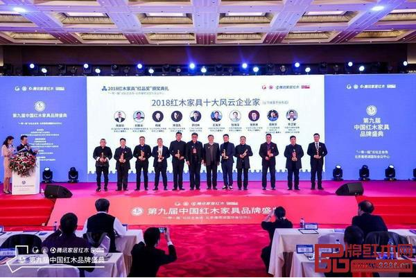 国寿红木总经理陈卫棠荣获“2018红木家具十大风云企业家”,国寿红木副董事长陈淦凡(右一)代其接受颁牌