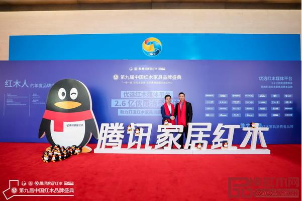 全联艺术红木家具专业委员会执行会长、腾讯家居红木频道总编、弘木传媒CEO林伟华与与国寿红木副董事长陈淦凡在盛典现场合影留念