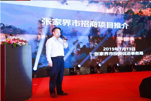 ▲张家界市投资促进局局长熊四清作招商推介