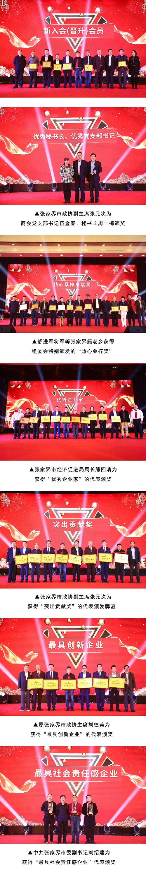 下午四点半,年会进入了颁奖典礼环节。在本次盛典现场,有多名为商会工作作出突出贡献的张家界籍企业家或个人获得了组委会颁发荣誉奖牌。其中周丰梅秘书长与伍金春书记分获“优秀秘书长”、“优秀党支部书记奖”,舒进军、李经桥等十六老乡荣获“热心桑梓奉献奖”,高大巨等五十二位企业家获得“优秀企业家”奖,会长幸志刚等十位企业家获得“突出贡献奖”,广东中匠工程建设有限公司、深圳大视界国际文化产业投资控股集团等六家企业获得“最具创新企业奖”,黄金铺投资集团、深圳禾田居投资有限公司、东莞市发鑫五金塑胶有限公司获得“最具社会责任感企业”奖。现场记者们用手中的手机相机纷纷记录下这难忘的一幕。逐步把年会气氛推向高潮。