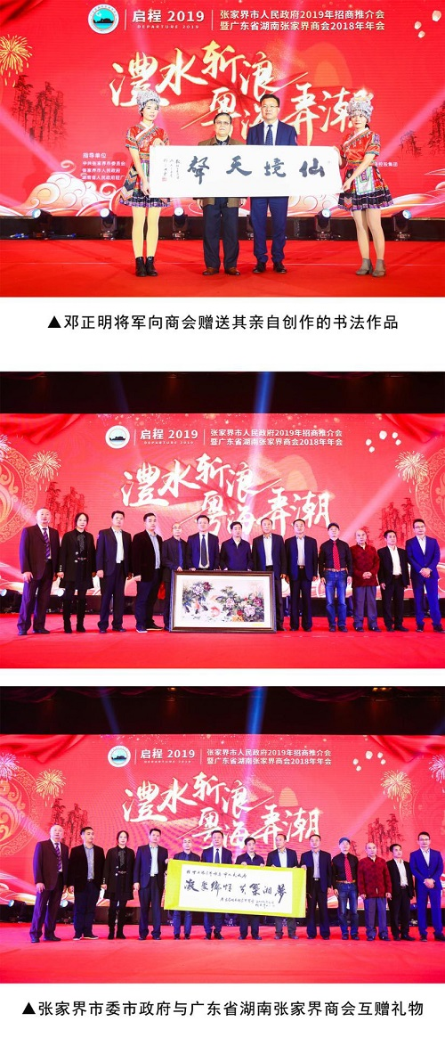 “澧水斩浪、粤海弄潮”。2019年1月13日下午,张家界市人民政府2019年招商引资推介会暨广东省湖南张家界商会2018年年会在中国首批白金酒店广州花园酒店一楼国际宴会厅隆重举行,现场宾客云集,热闹非凡,中共张家界市委、市人民政府、市人大、市政协及各区县主要领导亲临现场,广东省各级湘籍领导、来自广东省各地的张家界籍优秀企业家及新闻媒体等500余人共同见证了广东省湖南张家界商会这一年度盛事。