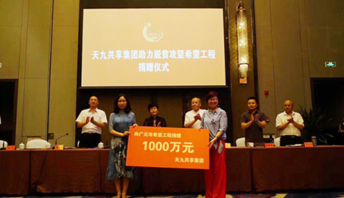 · 2018年,天九共享集团慈善公益再谱新篇。8月向广元市捐款1000万元,资助6600位困难学生上学,并向四川苍溪县和旺苍县捐赠1460万元,用于医疗扶贫、农业扶贫和敬老扶贫;出资1560万元,修建感恩堂义诊室和乡亲文化中心,并开始启动义诊室直升机急救。此外,为宁夏、新疆、青海、西藏等西部11省区扶贫捐款5000多万元。卢俊卿表示,2019年天九共享将加大精准扶贫力度,再捐2亿元,继续支持各地工商联的“万企帮万村”公益行动。