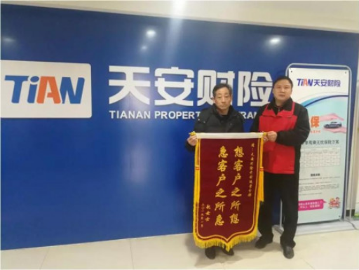 春节前夕,1月29日,王老先生特意赶到天安财险开封中支,送来一面印有“想客户之所想、急客户之所急”的锦旗,并紧紧握住中支工作人员的手,表示感谢。