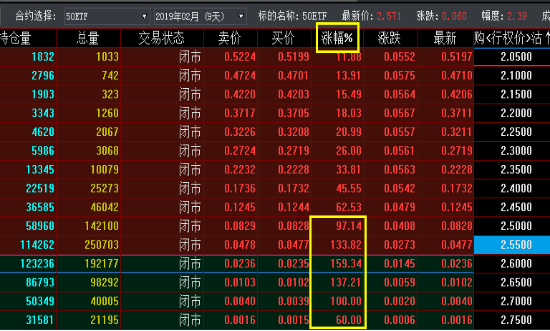 (2019年2月18日上证50ETF期权涨幅)