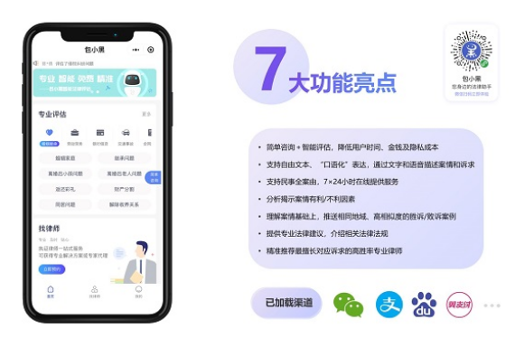 有智能手机就能用,在微信、支付宝、翼支付、手机百度等手机APP上能更方便地找到并使用“包小黑”(手机百度搜索“包小黑法律咨询评估”,其他APP直接搜索“包小黑”),敲字儿或语音描述问题,马上给出智能咨询和智能评估,关键还是全免费。