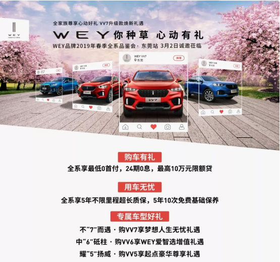 新春伊始、万象更新,中国豪华SUV品牌WEY亦御春风而行,将在3月2/3日于全国百城经销商展厅同时开展“WEY品牌2019春季品鉴会”,期待通过产品品鉴、动静态试驾、游戏互动等丰富体验形式与新老车主充分情感沟通,并为品牌用户献上2019开年钜惠大礼。作为第一个拥有23万用户拥趸的中国豪华品牌,WEY始终致力于用竭力虔心的“品价比”回馈用户,并为消费者带来独树一帜的“中式当代豪华”出行体验。籍此春季品鉴会,WEY品牌更将面向大众推出全系车型的购置解决方案,以多重心动礼遇助力用户轻松“拔草”梦想座驾。