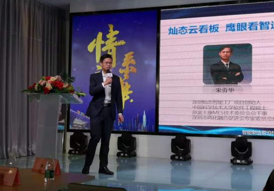 灿态科技总经理宋勇华是原富士康集团MES技术委员会总干事,他以18年富士康智能制造系统实践经验、100多个工厂信息化智能项目沉淀工作经历介绍了面向中小企业的智能制造落地方案。其解决方案依据他原创的三屏看智造理念,即“灿态鹰眼云看板”SaaS产品,打造符合企业发展实际需要和高性价比的智能化平台,助力中小企业智能化务实落地。