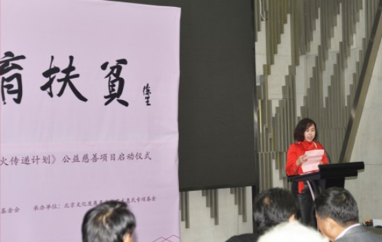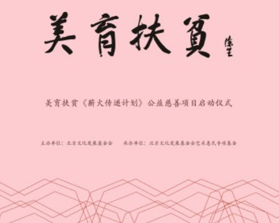 2019年3月8日,“薪火传递计划——美育扶贫千名书画教师培训活动项目”启动仪式在北京市798国际文化交流中心二楼会议厅举办。该项目为了响应北京市深入贯彻中央关于打好精准扶贫攻坚战的重大决策部署,落实国务院扶贫开发领导小组《关于广泛引导和动员社会组织参与脱贫攻坚的通知》、北京市民政局北京市扶贫协作和支援合作工作领导小组办公室《关于广泛动员社会组织参与脱贫攻坚和精准救助帮扶的指导意见》文件精神,由北京文化发展基金会发起成立,项目从2018年9月20日——2020年9月20日,执行时间两年,将通过募集全国各大画院、美术机构优秀艺术家作品,进行每年若干场的公益拍卖,向社会爱心企业筹集专项美育扶贫资金,该笔资金将定向支持千名优秀青年美术、书法教师,走入河北、内蒙古、西藏、青海、新疆等北京市对口支援帮扶地区及其他帮扶地区,通过中国传统文化和艺术的专业及系统教学,将美育带向贫困乡村,不仅提高贫困地区教师的艺术专业水平,也让更多贫困地区的孩子能受到美的熏陶和启蒙,提高贫困乡村孩子们的综合素质,将来能更好的走向社会,从而实现精准文化扶贫。
