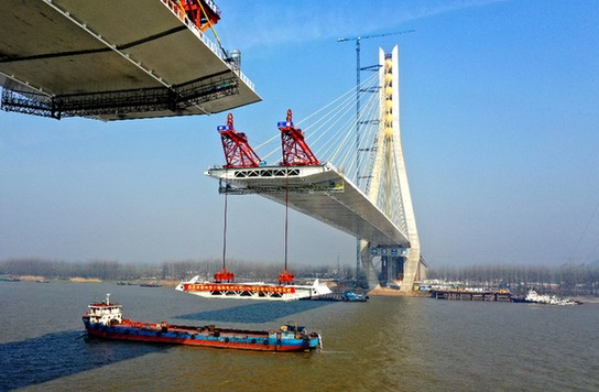 安徽池州长江公路大桥主桥长5.8千米,为双塔双索面斜拉桥,主跨828米,是连接安徽长江两岸的又一条快速通道,预计3月底实现主桥合龙,6月底具备通车条件。(来源: 经济参考报)
