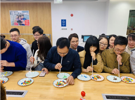 接着是传递游戏Straw Pass,用吸管传递M&M豆。学员们要用习惯从一盘MM豆里吸出自己团队的代表色,还要用咖啡搅拌勺舀起并搬运M&M 豆,绕中心走一圈。这个轻松的小游戏,让一些本担心不会说英语而放弃参加活动的学员们都跃跃欲试。最终学员James以2分钟成功用吸管移动37颗MM豆的成绩,引得全场的掌声。