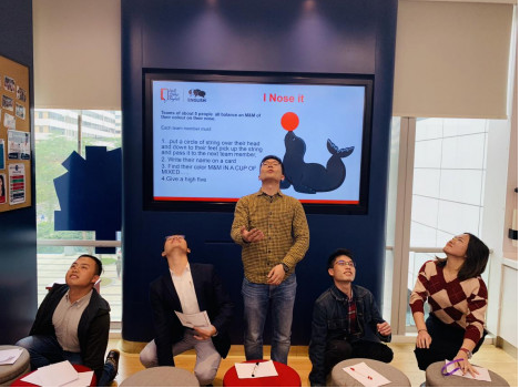 派对最后是外教Naomi演示的平衡游戏——“I Nose it”。每组学员选一名代表,用自己的鼻子顶着M豆来完成一系列非常考验肢体协调性的挑战。最终完成速度最快的是黄色MM队,他们获得了冠军!