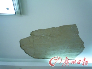 记者日前在璩先生家里看到,脱落的天花面积大概有0.7平方米,直径最长将近1米。“这次我坚决不交给开发商维修了,万一明年再掉怎么办?”