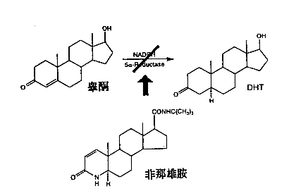 非那雄胺是睾酮代谢成为更强的雄激素双氢睾酮(DHT)过程中的细胞内酶-II型5α-还原酶的特异性抑制剂。它能抑制睾酮向双氢睾酮转化,导致血清和组织中的双氢睾酮浓度显著降低,阻止了双氢睾酮对毛囊的损伤,促进头发生长。