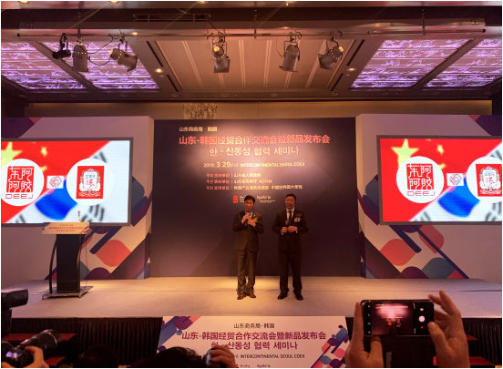 中新网山东新闻3月29日电(沙见龙 李欣)由山东省人民政府主办的“山东-韩国经贸合作交流会暨新品发布会” 3月29日在韩国首尔举行。中韩两家健康产业领军企业——东阿阿胶与韩国人参公社(正官庄)合作开发的“娇倍源红参阿胶饮品”全球首发。