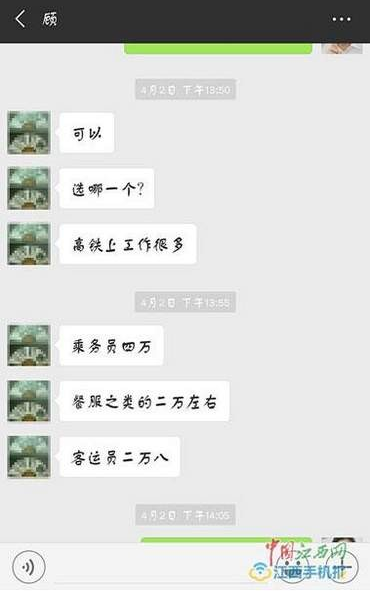 小郑告诉记者,面试内容餐服员”,且价格远高于其他人,小郑向记者提供了电话录音和微信消息。与合肥东铁旅服的邱经理,就是浙江动高实业有限公司人员的通话录音显示:就费用远高于其他人一事,邱经理解释称,本身小郑不是专业学校毕业的,武汉局的意见是她的气质形象不太符合商务座的标准。另一方面,高铁上乘务费用是比较高的,这在每一个人力资源公司都不一样,他能保证的就是南昌、南宁、福州这些地方可以试水,但不能说包进,但武汉这个地方,“我跟顾老师说的是包进,所以费用也不一样,而且,大家走的渠道不一样,有的人是从学校走的,前期的培训费用你又看到了吗?