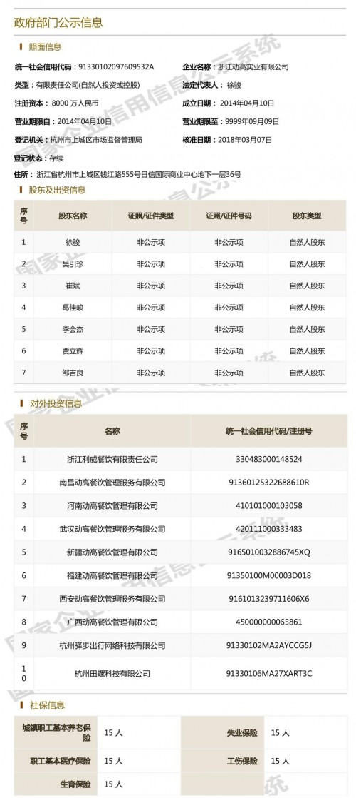 据了解,浙江动高实业有限公司控股了13家铁路派遣公司,分别是:广西动高餐饮管理有限公司、福建动高餐饮管理有限公司、南昌动高餐饮管理有限公司、河南动高餐饮管理有限公司、新疆动高餐饮管理有限公司、武汉动高餐饮管理有限公司、西安动高餐饮管理有限公司、安徽动高科技有限公司、昆明领鲜餐饮管理有限公司、郑州佰炒园餐饮管理有限公司、浙江利威食品有限公司、杭州田螺科技公司、杭州驿步出行科技有限公司。