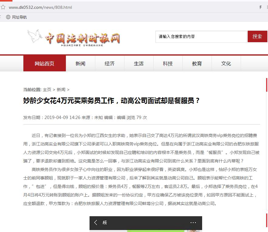 近日,有记者接到一位名为小郑的江西女生的求助,她表示自己交了高达4万元的所谓武汉高铁商务vip乘务岗位的招聘费用,浙江动高实业有限公司旗下公司承诺可以入职高铁商务vip乘务岗位。但是在向属于浙江动高实业有限公司的合肥东铁旅服人力资源公司交完4万元后,小郑面试的时候却发现自己应聘和培训的内容根本不是乘务员,而是“餐服员”。小郑发现自己被骗了,要求退款却遭到拒绝。这究竟是怎么一回事,与浙江动高实业有限公司到底什么关系?里面到底有什么内幕呢?