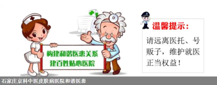 自建院以来,石家庄京科皮肤病医院一直秉持正规行医、诚信行医的态度,服务广大皮肤病患者患者,并且本着“人才兴院,特色办院,质量建院”的总体思路,走“适宜发展、创新发展”的路线,努力为百姓造成良好就医环境,不断改进医院不足,并特邀三甲专家一同会诊,全程把关规范化操作,高度保障患者安全。