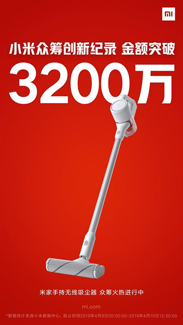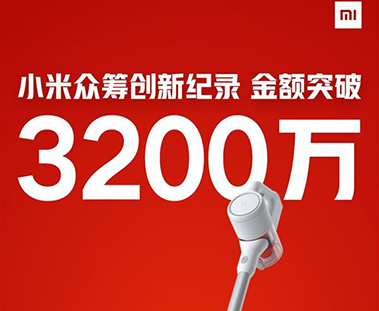 小米官方宣布,米家手持无线吸尘器的众筹金额已经突破3200万元,创下小米众筹有史以来的最高纪录。