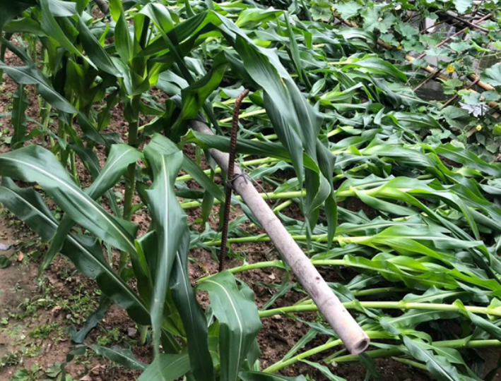 昨晚,东莞突发狂风暴雨,沙田镇穗丰年村农田一片狼藉,不少蔬菜都被冲垮了,其中玉米最受伤,一整排都倒下了。为了及时止损,今天一大早,农户就到田地里将玉米扶起,用竹子和钢筋固定玉米,希望使自家作物尽快恢复过来,减少损失。(来源:东莞阳光网)