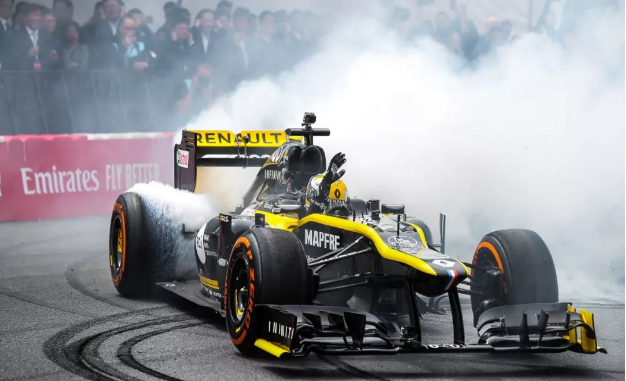 随着引擎声响起,F1赛车启动加速、飞驰而过