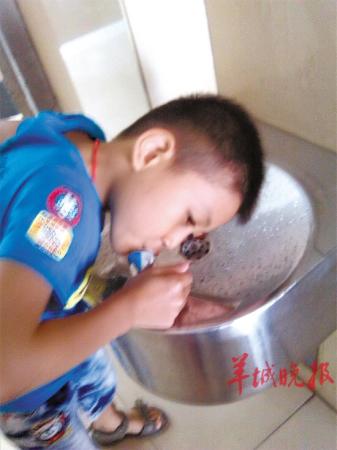 一小孩正在东莞市图书馆的直饮水水龙头前接水喝