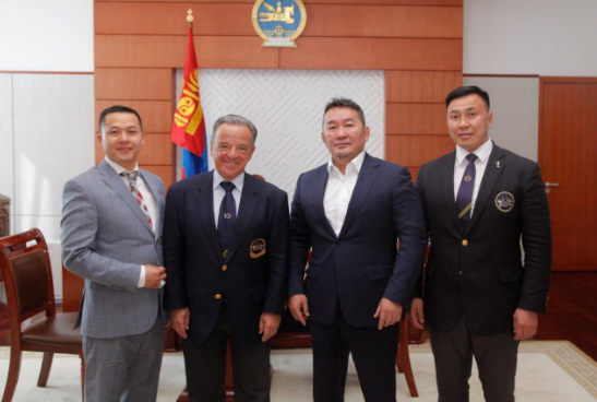 蒙古国总统巴特图勒嘎与蒙中一带一路贸促会潘高峰先生以及IFBB两位领导人合影