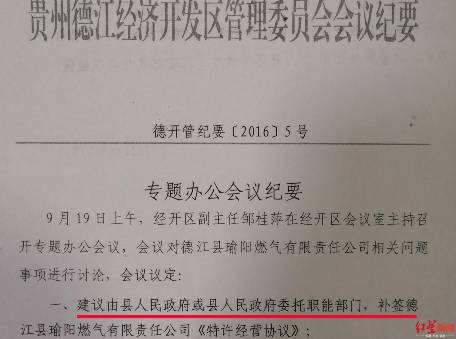 2016年9月19日印发的贵州德江经济开发区管理委员会会议纪要“德开管纪要[2016]5号”文件提到,该专题办公会议议定:建议由县人民政府或县人民政府委托职能部门,补签德江县瑜阳公司《特许经营协议》。
