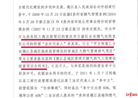 之后,重庆人李中文经永安公司“法定代表人”李善贵许可,出资注册成立了贵州省德江县瑜阳燃气有限公司(简称瑜阳公司)。2011年6月,李中文夫妇持前述招商合同,向德江县住房和城乡规划建设局申领《燃气管道特许经营权》证件,后者以德住建发[2011]48号文件的形式,行文授予瑜阳公司“享有30年使用期限的燃气特许经营权(非证件)”。