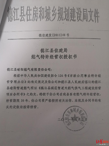 ▲德住建发[2011]48号文件授予瑜阳公司“享有30年使用期限的燃气特许经营权”。