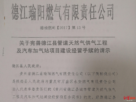 2013年7月,瑜阳公司向德江县政府提交《关于完善燃气经营许可法定手续的报告》。其中提到,请求县政府与该公司补签《德江县管道天然气特许经营合同》,确保实现合法经营。