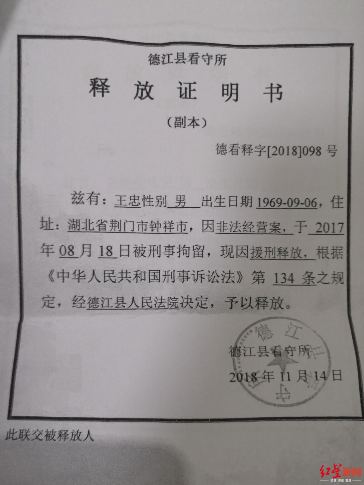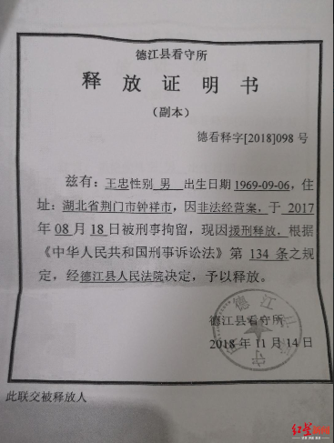 德江县看守所释放证明书显示,2017年8月18日,对瑜阳公司安全隐患专项核查尚未结束,作为法定代表人的王忠便被刑拘。