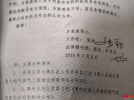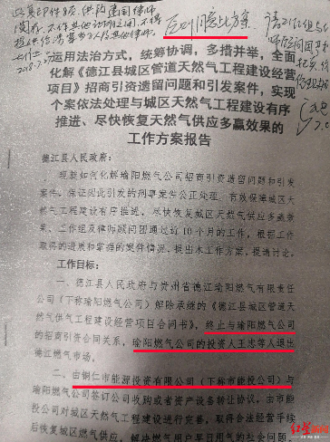 王忠向红星新闻记者展示一份由上述工作组向德江县政府呈报的相关“工作方案报告”。这份落款日期为2018年7月的报告,在“律师意见”描述中指出,瑜阳公司至今未取得燃气经营许可证原因复杂,不能简单归结到瑜阳公司一方。