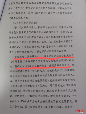 前述法院判决显示,2011年8月,李中文夫妇将瑜阳公司100%股权及全部资产以1500万元转让给王忠夫妇。2012年2月,王忠携带李中文移交的企业资料,在德江县工商行政管理局办理了过户变更登记。后者当日将瑜阳公司《企业法人营业执照》过户到王忠名下,经营项目范围由原来的“筹建”调整扩大为“燃气经营、汽车加气”等9个方面。