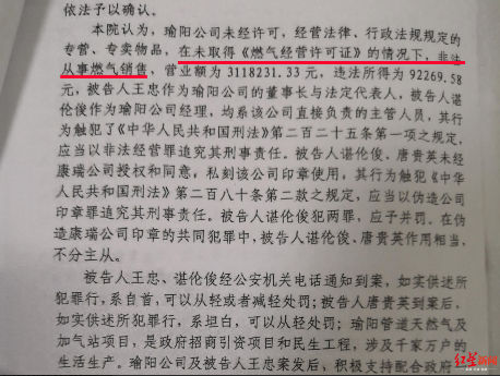 法院在判决中同时指出,瑜阳管道天然气及加气站项目,是政府招商引资项目和民生工程,涉及千家万户的生活生产。瑜阳公司及被告人王忠案发后,积极支持配合政府一揽子解决方案,为尽快恢复供气、化解矛盾,消除社会不安定因素,作出了努力;考虑本案系多因一果,政府对招商引资企业瑜阳公司有“先上车后补票”情形的实际情况,结合被告单位瑜阳公司、被告人王忠、谌伦俊、唐贵英认罪认罚的表现,综合考量,可依法对被告单位瑜阳公司、被告人王忠、谌伦俊、唐贵英从轻从宽处罚。