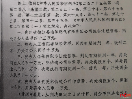 去年11月,49岁的王忠因犯非法经营罪,被贵州省德江县法院判处有期徒刑二年、缓刑二年。法院认定,王忠任法定代表人的瑜阳公司,在未取得《燃气经营许可证》的情况下,非法从事燃气销售。