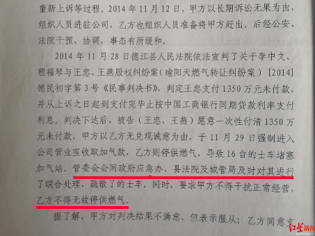 报告显示,李中文在与王忠股权转让款纠纷解决期间,曾在11月29日强制进入瑜阳公司营业室收取加气费,瑜阳公司便采取停供燃气。事后,管委会会同政府应急办、县法院及城管局进行联合处理时,要求瑜阳公司不得无故停供燃气。