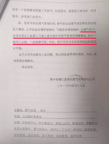 记者注意到,在瑜阳公司2013年4月呈报德江县工业园区管委会的《关于解决公司存续问题的报告》中,有相关表述与李中文的上述说法相吻合。报告提到,“从通气至今,先后共发生三起第三方施工意外破坏天然气管道的泄露事故,其中一起无人认账,一起耍赖不赔。对此,因公司作为企业没有执法权而无计可施。”