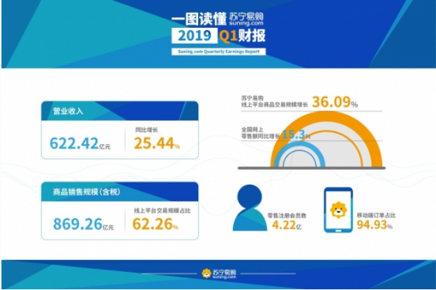 4月29日晚间,国内智慧零售龙头企业苏宁易购(002024.SZ)发布2019年一季度报告。一季报显示,智慧零售战略持续助推苏宁易购快速增长,苏宁易购一季度营业收入为622.42亿元,同比增长25.44%;全渠道商品销售规模为869.26亿元,其中线上自营商品销售规模同比增长40.87%。一季度,苏宁易购实现归母净利润1.36亿元。