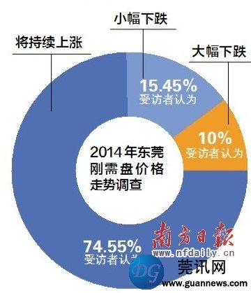 即便大部分的受访者觉得当前东莞的房价水平过高,可他们并不认为房价会因此下降。逾七成受访网友表示,2014年东莞刚需盘房价走势将会持续上涨,15.45%受访网友网友认为会小幅下跌,仅有10%受访网友认为会大幅下跌。