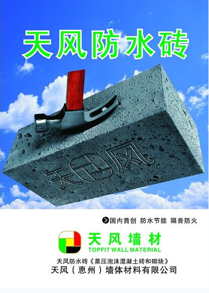 当前,建筑工程领域,环保、节能是衡量材料的重要标准之一,天风防水砖在原料上更易得,在制作工艺上更先进环保,整个制作过程中无有害气体产生,在废弃后也可再次加工制作利用。完全没有传统的红砖需要经过烧制等多重工序才能制作而成,烧制过程中产生大量废气,并且废弃后也会对环境造成二次污染等等缺点。目前,天风防水砖已经取得广东省《非承重蒸压泡沫混凝土砖墙体工程技术规程》地方标准,DBJ/T15-43-2005,在众多建筑墙体施工中使用。