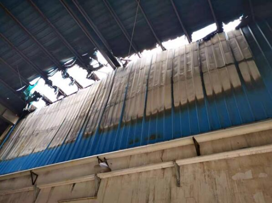 一墙之隔,失火的一边机器物资化为灰烬,房顶钢梁烧融变形