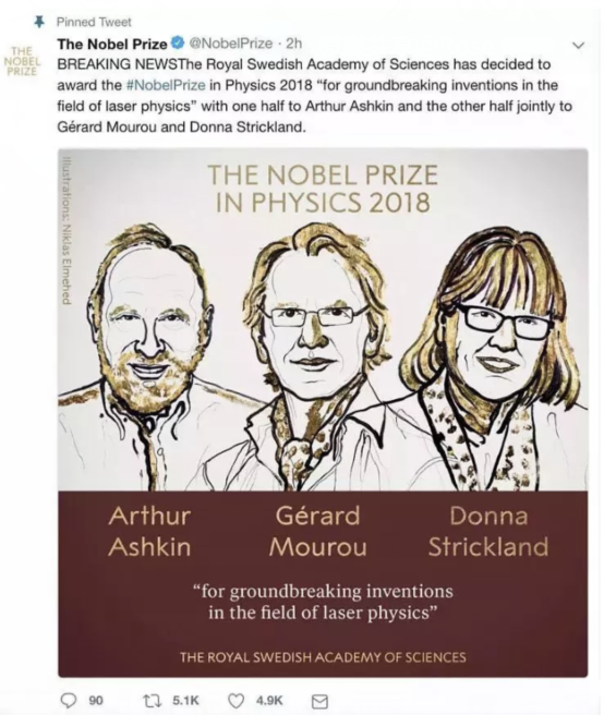 2018年10月2日,诺贝尔物理学奖之一授予了激光的啁啾脉冲放大技术,发明者为热拉尔·穆鲁以及唐娜·斯特里克兰。此发明和研究被广泛应用在了眼科屈光手术之中,可以让医生在眼角膜上实施微米级的微创视力矫正手术,矫正视力而不损伤眼球。